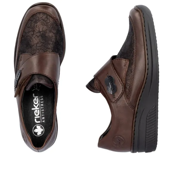 Rieker, la marque au trés bon rapport qualité prix!Mocassin Rieker 487C0-25 à velcro femme en cuir et textile marron.